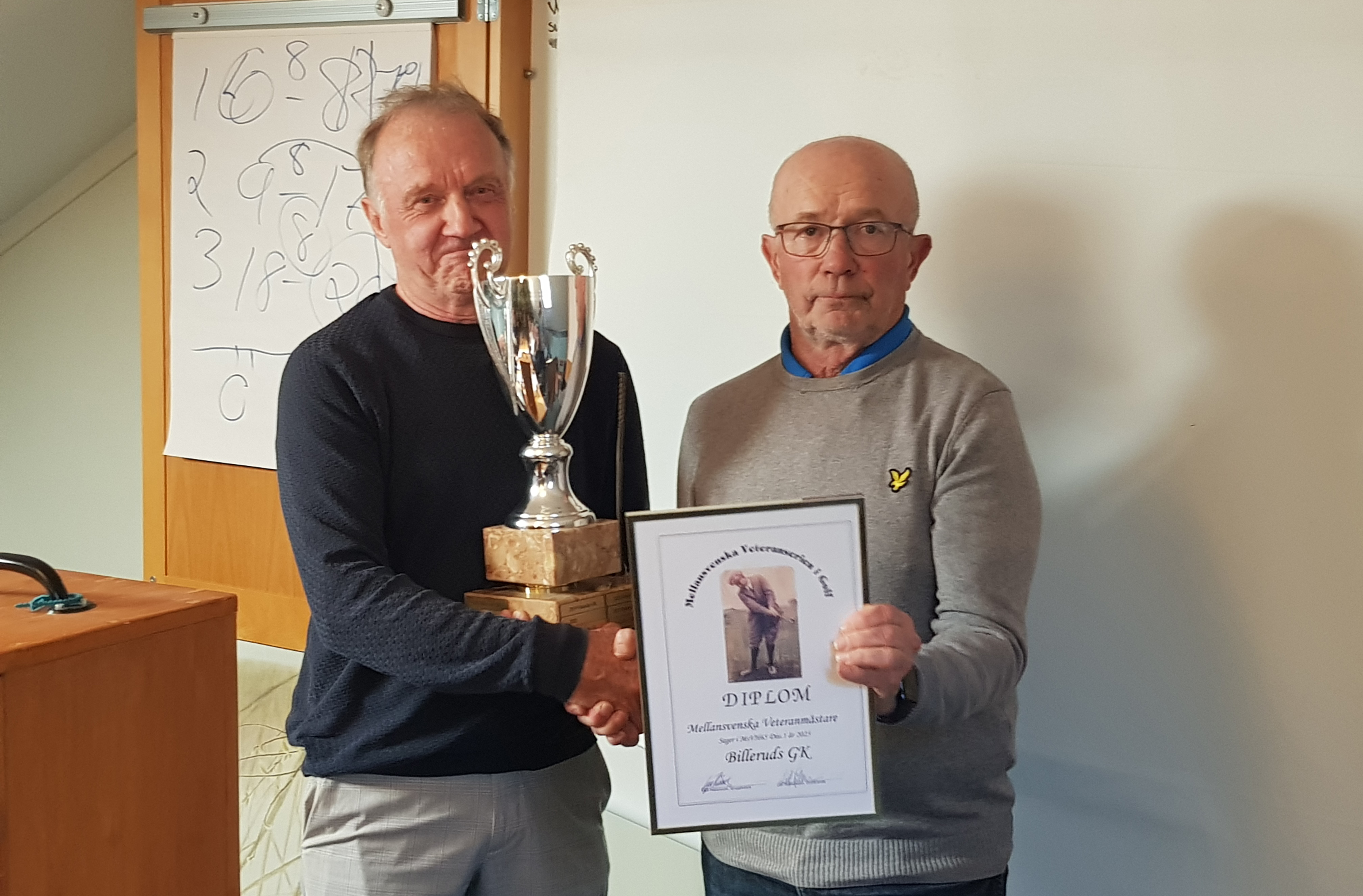 Billeruds GKs lagledare Håkan Edkvist (t.v.) har tagit emot vandringspris och diplom för segern 2025, av MsVs Ordförande Leif Johansson.
